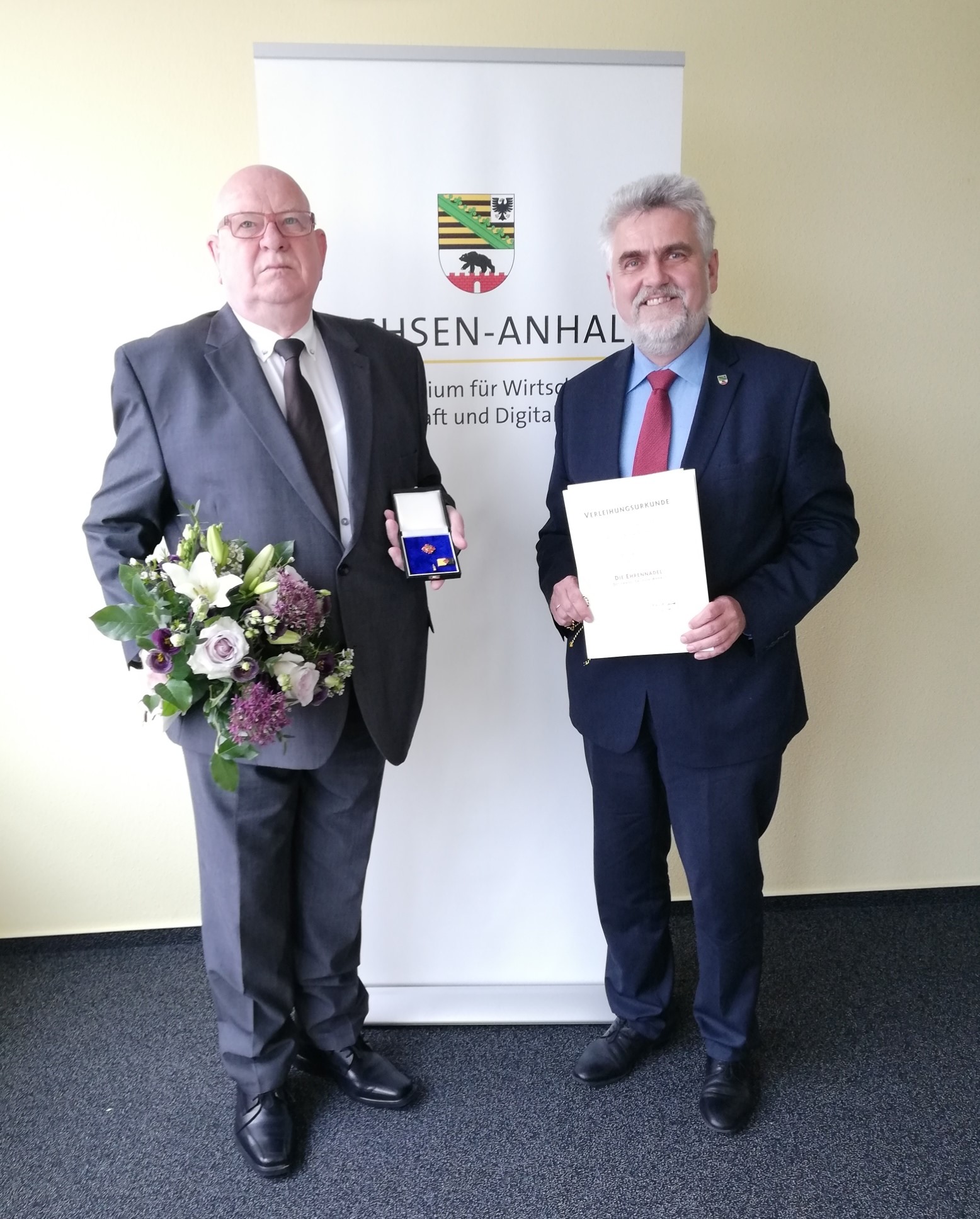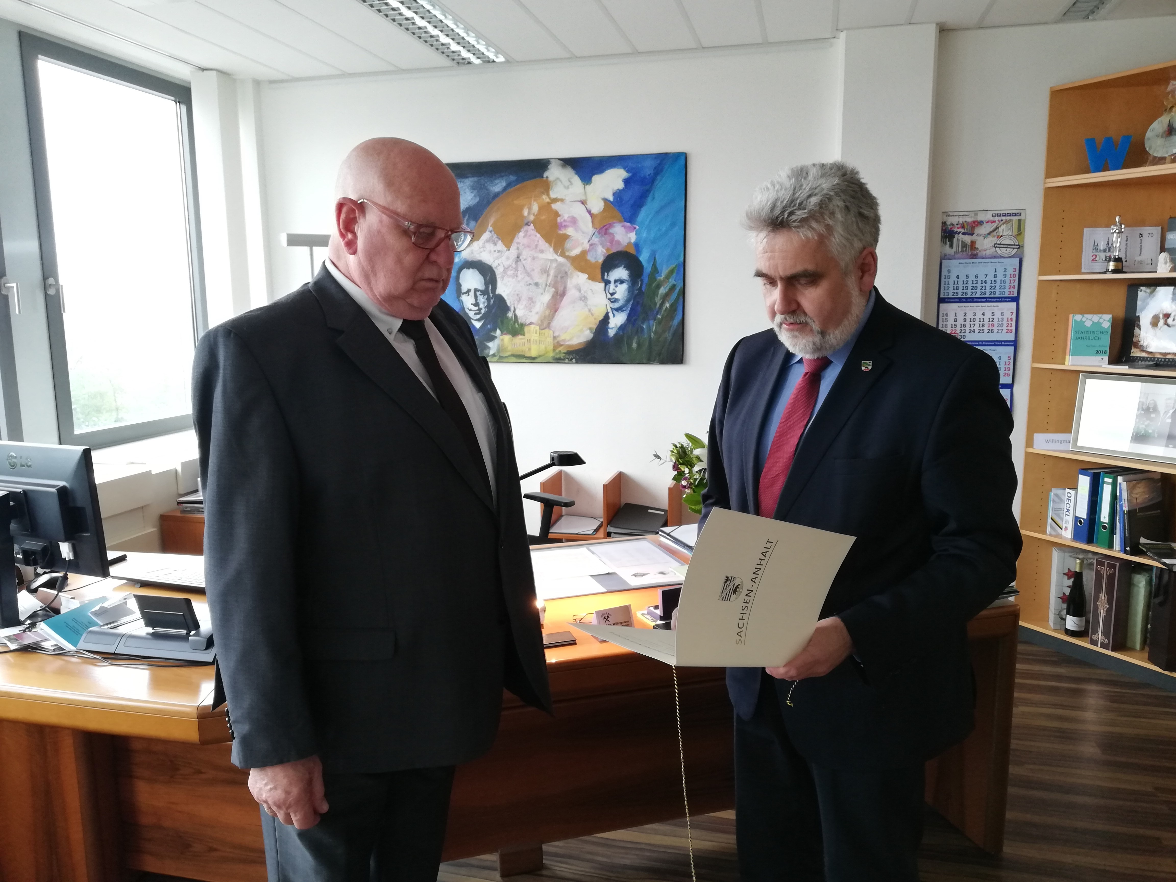 | Wir sind freudig überrascht, als wir Kenntnis erhielten, dass unser Mitglied und Leiter der Fachgruppe "Burgen, Schlösser, Herrenhäuser", Bernd Rauchensteiner, aus den Händen unseres Wirtschaftsministers Herr Prof. Dr. Willingmann die Ehrennadel des Landes Sachen-Anhalt am 29.04.2018 erhielt. Diese Auszeichnung ist nach dem Verdienstorden die zweithöchste Auszeichnung unseres Landes. Wir gratulieren recht herzlich. |