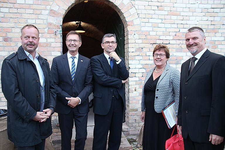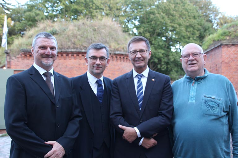 | Linken-Fraktionschef im Landtag Sachsen-Anhalt, Wulf Gallert, der Vorsitzende der Deutsch-Polnischen Gesellschaft, Krzysztof Blau, der Botschafter der Republik Polen Prof. Andrzey Przylebski, die Präsidentin des Landtages von Sachsen-Anhalt, Gabriele Brakebusch und Rüdiger Stefanek vom Sanierungsverein "Ravelin 2" waren sich einig, dass die historischen Anlagen der alten Festung der richtige Platz für eine Erinnerung an den polnischen Marschall ist. | Rüdiger Stefanek, Vorsitzender des Sanierungsvereins "Ravelin 2", Botschafter der Republik Polen Prof. Andrzey Przylebski, Vorsitzender der Deutsch-Polnischen Gesellschaft, Krzysztof Blau und Fachgruppenleiter der FG Burgen, Schlösser und Herrenhäuser des Kultur- und Heimatvereins Magdeburg, Bernd Rauchensteiner (v.li.) besichtigten die Anlagen des Ravelin 2 in in der Maybachstraße.