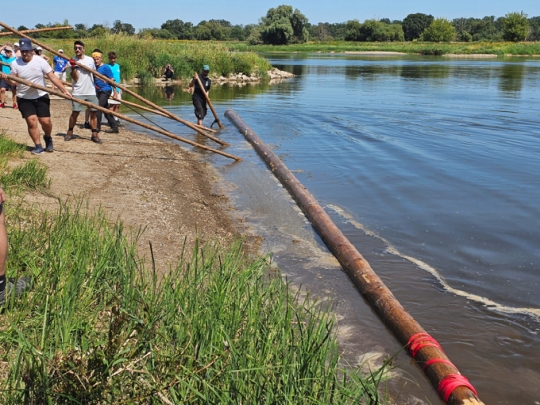 Gemeinsam wurden die 19 Meter langen Stämme vom Floßbauplatz ins Wasser gerollt.