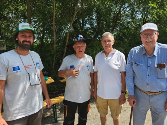Tilo Garlipp-Gramann, Projektleiter der Arbeit und Leben gGmbH, Frank Thiel, Präsident des IATR, Jaroslaw Camplik, Vizepräsident des IATR und Josef Bilek, Flößermeister aus Tschechien (v.li.) verfolgten begeistert die Arbeiten der jungen Flößerinnen und Flößer.