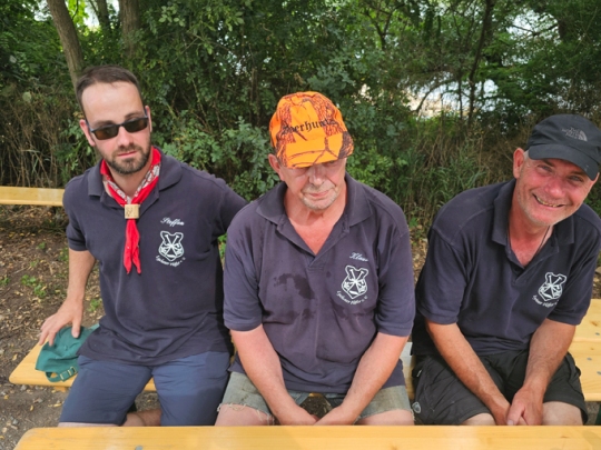 Die Lychener Flößer Steffen Schöttler, Klaus Schöttler und Harald Waltrich (v.li.) bauten schon zum zweiten Mal an einem Elbefloß mit. Trotz des bevorstehenden Flößerfestes in Lychen nahmen sie sich die Zeit, ihre Floßbaukünste den jungen Flößern aus Spanien, Italien, Slowenien, Rumänien, Litauen und Deutschland zu vermitteln.
