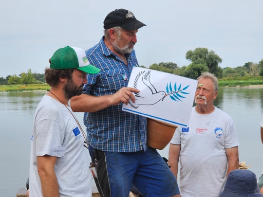 Friedenstaube mit Th. Kipp: Ein Olivenbäumchen und eine Friedenstaube brachten die Schiltacher Flößer um Thomas Kipp (Bildmitte) mit, hier assistiert von Projektleiter Tilo Garlipp-Gramann (links) und Kapitän Dietmar Felke. Der Flößermeister erinnerte die Jugendlichen eindringlich daran, sich für den Weltfrieden einzusetzen.