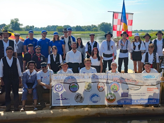 (F.T./J.H.) Das erste multinationale Camp der Flößer ist zu Ende. Jugendliche aus sechs Ländern bauten in Magdeburg gemeinsam mit erfahrenen Flößermeistern aus Schiltach (Schwarzwald) und Lychen (Brandenburg) ein 19 Meter langes und 20 Tonnen schweres Floß „Albis 2“ und befuhren die Elbe zwischen dem Bauplatz in Westerhüsen bis zum Hanseterminal in Rothensee. Neben der Pflege dieser traditionellen Handwerkskunst als von der UNESCO anerkanntes Immaterielles Kulturerbe der Menschheit standen die internationale Zusammenarbeit, das Erlernen von unterschiedlichen Techniken des nachhaltigen Werkstoffes Holz, der Erfahrungsaustausch und natürlich auch das gesellige Leben nach getaner Arbeit im Camp im Mittelpunkt, welches dank großartiger Unterstützung beim Wassersportvereins Buckaus Fermersleben aufgebaut werden konnte. Die Versorgung übernahm das Team vom „Bootshaus am Yachthafen“. Auch Mitglieder der Fachgruppe Elbeflößer beim Kultur- und Heimatverein Magdeburg halfen tatkräftig mit. Und auch die Frauen vom Heimatverein Beyendorf-Sohlen in ihren traditionellen Trachten faszinierten die ausländischen Gäste mit leckerem selbstgebackenem Kuchen. Der Schirmherr des großen internationalen Projektes, Wirtschaftsminister Sven Schulze, dankte den Wegbereitern dieses Treffens, der Arbeit und Leben Sachsen-Anhalt gGmbH und der Internationalen Flößereivereinigung sowie dem Projektpartner Petro Aqua aus dem rumänischen Petrosani, vor der Fahrt auf der Elbe ganz herzlich für das große Engagement. Der Präsident des Internationalen Flößervereins, Frank Thiel bezeichnete selbst dieses Projekt als die Erfüllung eines Lebenstraumes und bedankte sich bei den Schiltacher und Lychener Floßbaumeistern für eine gelungen Lehrvorführung des Floßbaus. Sein ganz besonderer Dank galt der Europäischen Union, die dieses Camp mit Mitteln aus dem ERASMUS-Programm zur Förderung der internationalen Begegnung und der friedlichen Völkerverständigung mitfinanziert hatte. Mehr als ein Dutzend Behörden und Einrichtungen von Bund, Land und Landeshauptstadt sowie Unternehmen aus Region unterstützen durch ihre Arbeit die Vorbereitung und den erfolgreichen Verlauf dieses Treffens. Der prall gefüllte Tageskalender wurde ergänzt mit Seminaren zu Rolle des Holzes als nachhaltiger Rohstoff, zum Umgang mit der Flößerei als Immaterielles Kulturerbe der Menschheit, mit Diskussionen zur ehrenamtlichen Tätigkeit der Vereine in den Ländern und der Verantwortung für die jungen Generationen.