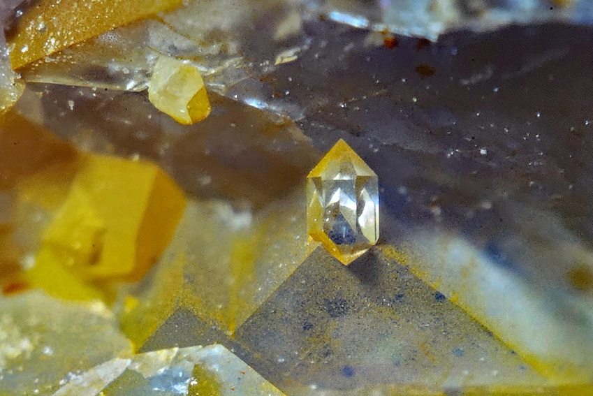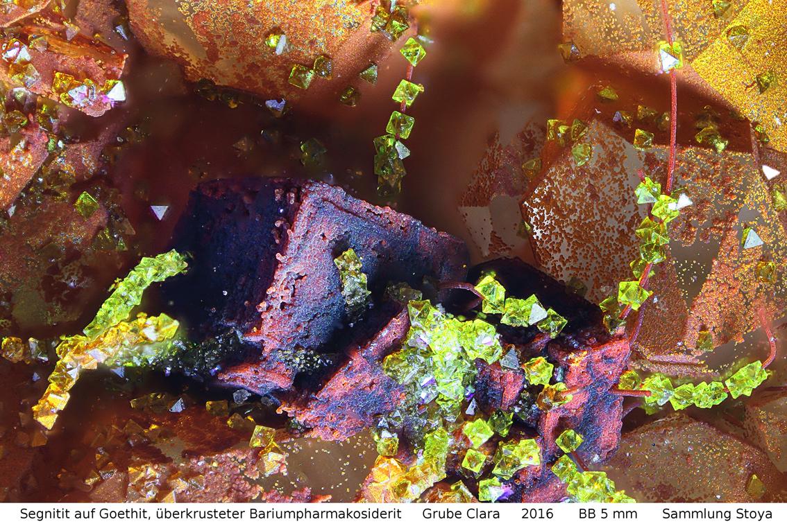 Segnitit auf Goethit mit Pharmakosiderit, Grube Clara, Bildbreite 5,0 Millimeter. |