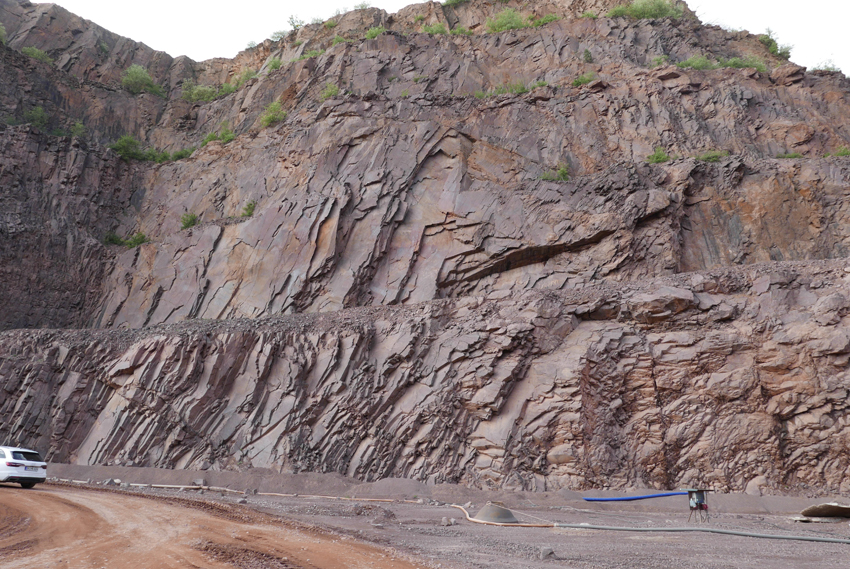 Nach dem kulturellen Beginn der Exkursion ging es in den nahe gelegenen Steinbruch Petersberg, in den wir mit den Fahrzeigen einfahren konnten (Bild 3). Interessant ist die Ausbildung des kleinporphyrischen Rhyoliths, in dem auch einige Minerale gefunden wurden (Bild 4).