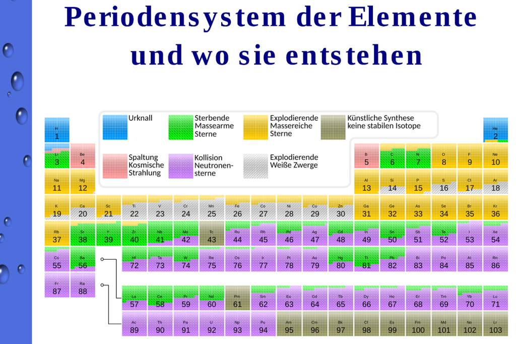 Am 08. April 2026 hielt unser Gruppenmitglied Marian Szengel einen Vortrag zu o.g. Thema. Er berichtete über die physikalischen Bedingungen, unter denen chemische Elemente entstehen. Druck und Wärme, die notwendig sind um kleine Atomkerne zu größeren zu verschmelzen. Orte, wo diese physikalischen Bedingungen herrschen und Prozesse die ablaufen, damit Elemente mit verschiedenen Eigenschaften entstehen und sich im Universum verteilen.